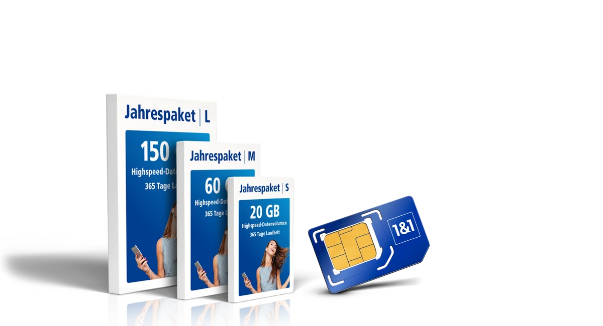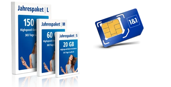 1&1 Prepaid Jahrespaket M mit 60 GB Highspeed-Volumen/Jahr (bis zu 300 MBit/s im Download/bis zu 50 MBit/s im Upload, nach Verbrauch je max. 64 kBit/s) für 69,99 € einmalig, zahlbar im Voraus. Gratis Telefonieren und Surfen gilt nicht für Sonder- und Premiumdienste, Verbindungen aus Deutschland ins Ausland sowie Roaming außerhalb EU gemäß Preisliste. Telefonate in dt. Fest- und Handynetze inklusive sowie Verbindungen innerhalb des EU-Auslands und aus EU nach Deutschland plus Island, Liechtenstein und Norwegen. Ggfs. entstandene verbrauchsabhängige Kosten werden monatlich abgerechnet. Bereitstellungspreis 0,– €. 12 Monate Mindestvertragslaufzeit. Der Vertrag endet automatisch nach Ablauf der Mindestvertragslaufzeit, ohne dass es einer Kündigung bedarf. Die Aktivierung setzt eine Identitätsprüfung durch Vorlage eines Ausweises voraus.