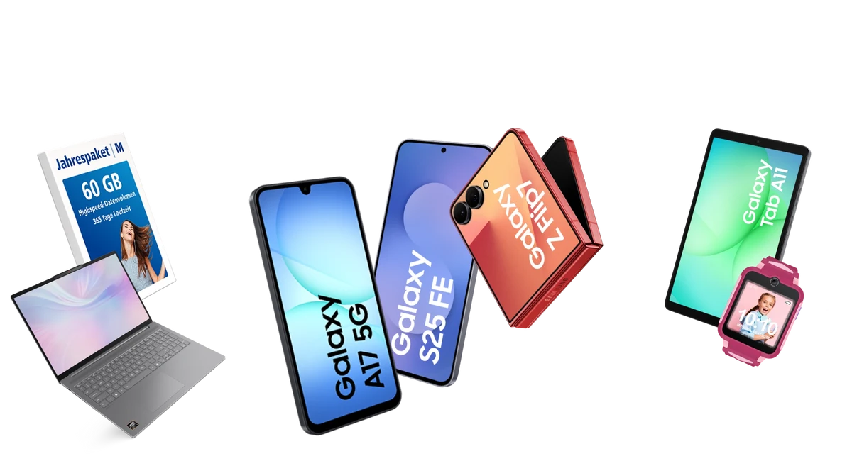 Das Samsung Galaxy A17 5G, das Samsung Galaxy S25 FE oder das Samsung Galaxy Z Flip7, z.B. in Verbindung mit der 1&1 All-Net-Flat XS mit Multicard und 10 GB Highspeed-Volumen/Mon. (bis zu 300 MBit/s Download/bis zu 50 MBit/s Upload, danach je max. 64 kBit/s) für dauerhaft 9,99 €/Mon. (A17), 19,99 €/Mon. (S25 FE) bzw. 29,99 €/Mon. (Z Flip7). Mindestvertragslaufzeit je 24 Monate, danach jederzeit kündbar mit 30,– € (A17), 150,– € (S25 FE) bzw. 270,– € (Z Flip7) Einmalzahlung, zahlbar bei Vertragsende, spätestens nach 36 Vertragsmonaten. Oder ohne Einmalzahlung bei Auswahl eines neuen Geräts bei 1&1 und Rücksendung des Altgerätes in gebrauchsfähigem Zustand. Alternativ wird treuen Kunden, sofern der Vertrag nach 36 Monaten noch besteht, die Einmalzahlung im 36. Monat automatisch gutgeschrieben, sodass sie sich auf 0,– € reduziert (Geräterückgabe hierfür nicht erforderlich). Gratis Telefonieren gilt nicht für Sonder- und Premiumdienste, Verbindungen aus Deutschland ins Ausland sowie Roaming außerhalb der EU gemäß Preisliste. Inklusive Telefonate in dt. Fest- und Handynetze sowie Verbindungen innerhalb des EU-Auslands und aus der EU nach Deutschland. Energieeffizienz: S25 FE: B, A17 5G: B, Z Flip7: B. Bereitstellungspreis je 39,90 €. Das Lenovo IdeaPad Slim 5 oder das Samsung Galaxy Tab A11, z.B. in Verbindung mit der 1&1 Daten-Flat S mit 10 GB Highspeed-Volumen/Mon. (bis zu 300 MBit/s Download/bis zu 50 MBit/s Upload, danach je max. 64 kBit/s), für 29,99 €/Mon. (IdeaPad Slim 5) bzw. 14,99 €/Mon. (Tab A11). Mindestvertragslaufzeit je 24 Monate, danach jederzeit kündbar mit 260,– € (IdeaPad Slim 5) bzw. 80,– € (Tab A11) zahlbar bei Vertragsende, spätestens nach 36 Vertragsmonaten. Oder ohne Einmalzahlung bei Auswahl eines neuen Geräts bei 1&1 und Rücksendung des Altgerätes in gebrauchsfähigem Zustand. Alternativ wird treuen Kunden, sofern der Vertrag nach 36 Monaten noch besteht, die Einmalzahlung im 36. Monat automatisch gutgeschrieben, sodass sie sich auf 0,– € reduziert (Geräterückgabe hierfür nicht erforderlich). Gratis Surfen gilt nicht für Sonder- und Premiumdienste. Eine Nutzung der Datenflatrate für Voice over IP ist nicht gestattet. Energieeffizienz Tab A11: D. Bereitstellungspreis je 39,90 €. Die TCL Kids Watch, z.B. in Verbindung mit 1&1 Kids 1GB mit 1 GB Highspeed-Volumen/Mon. (bis zu 50 MBit/s Download/bis zu 25 MBit/s Upload, danach je max. 64 kBit/s) für 7,99 €/Mon. Telefonie/SMS: 100 Freieinheiten für Telefon-Minuten und/oder SMS pro Monat in alle Fest- und Mobilfunknetze innerhalb Deutschlands, des EU-Auslands und aus EU nach Deutschland plus Island, Liechtenstein und Norwegen. Kostenkontrolle durch voreingestellt gesperrte kostenpflichtige Sonder- und Servicerufnummern der Rufnummerngassen 0900, 0180, 118 und 0137 bei Inlandsnutzung, Premium-Voice/SMS, internationale Verbindungen aus Deutschland ins Ausland sowie Roaming-Verbindungen; Internationale Verbindungen aus Deutschland ins Ausland sowie Roaming-Verbindungen auf Kundenwunsch wieder aktivierbar; Preise gemäß Preisliste. Auf Wunsch inklusive Einrichtungshilfe für Kinderschutz-Apps Google Family Link oder Apple iOS Kinderschutz. Bereitstellungspreis 19,90 €. 24 Monate Mindestlaufzeit. 1&1 Prepaid Jahrespakete z.B. das Jahrespaket S mit 20 GB Highspeed-Volumen/Jahr (bis zu 300 MBit/s im Download/bis zu 50 MBit/s im Upload, nach Verbrauch je max. 64 kBit/s) für 49,99 € einmalig, zahlbar im Voraus. Einmalige SIM-Kartengebühr 29,90 €, inklusive 30 € Startguthaben nach Aktivierung. 12 Monate Mindestvertragslaufzeit. Der Vertrag endet automatisch ohne, dass es einer Kündigung bedarf. Für alle Angebote gilt: Änderungen und Irrtümer vorbehalten. Preise inkl. MwSt. 1&1 Telecom GmbH, Elgendorfer Straße 57, 56410 Montabaur.