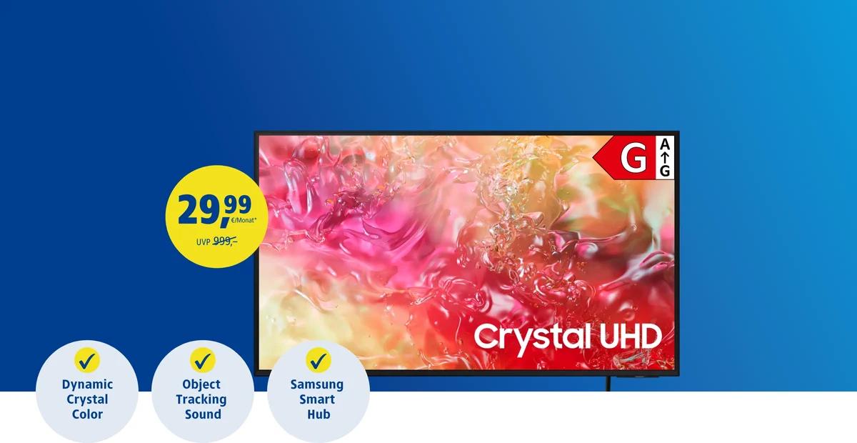 - Samsung TV 65″, 163 cm (z.B. Modell GU65DU7170UXZG). Je nach Verfügbarkeit sind auch vergleichbare Modelle möglich.