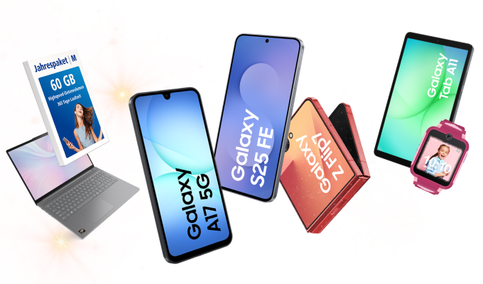 Das Samsung Galaxy A17 5G, das Samsung Galaxy S25 FE oder das Samsung Galaxy Z Flip7, z.B. in Verbindung mit der 1&1 All-Net-Flat XS mit Multicard und 10 GB Highspeed-Volumen/Mon. (bis zu 300 MBit/s Download/bis zu 50 MBit/s Upload, danach je max. 64 kBit/s) für dauerhaft 9,99 €/Mon. (A17), 19,99 €/Mon. (S25 FE) bzw. 29,99 €/Mon. (Z Flip7). Mindestvertragslaufzeit je 24 Monate, danach jederzeit kündbar mit 30,– € (A17), 150,– € (S25 FE) bzw. 270,– € (Z Flip7) Einmalzahlung, zahlbar bei Vertragsende, spätestens nach 36 Vertragsmonaten. Oder ohne Einmalzahlung bei Auswahl eines neuen Geräts bei 1&1 und Rücksendung des Altgerätes in gebrauchsfähigem Zustand. Alternativ wird treuen Kunden, sofern der Vertrag nach 36 Monaten noch besteht, die Einmalzahlung im 36. Monat automatisch gutgeschrieben, sodass sie sich auf 0,– € reduziert (Geräterückgabe hierfür nicht erforderlich). Gratis Telefonieren gilt nicht für Sonder- und Premiumdienste, Verbindungen aus Deutschland ins Ausland sowie Roaming außerhalb der EU gemäß Preisliste. Inklusive Telefonate in dt. Fest- und Handynetze sowie Verbindungen innerhalb des EU-Auslands und aus der EU nach Deutschland. Energieeffizienz: S25 FE: B, A17 5G: B, Z Flip7: B. Bereitstellungspreis je 39,90 €. Das Lenovo IdeaPad Slim 5 oder das Samsung Galaxy Tab A11, z.B. in Verbindung mit der 1&1 Daten-Flat S mit 10 GB Highspeed-Volumen/Mon. (bis zu 300 MBit/s Download/bis zu 50 MBit/s Upload, danach je max. 64 kBit/s), für 29,99 €/Mon. (IdeaPad Slim 5) bzw. 14,99 €/Mon. (Tab A11). Mindestvertragslaufzeit je 24 Monate, danach jederzeit kündbar mit 260,– € (IdeaPad Slim 5) bzw. 80,– € (Tab A11) zahlbar bei Vertragsende, spätestens nach 36 Vertragsmonaten. Oder ohne Einmalzahlung bei Auswahl eines neuen Geräts bei 1&1 und Rücksendung des Altgerätes in gebrauchsfähigem Zustand. Alternativ wird treuen Kunden, sofern der Vertrag nach 36 Monaten noch besteht, die Einmalzahlung im 36. Monat automatisch gutgeschrieben, sodass sie sich auf 0,– € reduziert (Geräterückgabe hierfür nicht erforderlich). Gratis Surfen gilt nicht für Sonder- und Premiumdienste. Eine Nutzung der Datenflatrate für Voice over IP ist nicht gestattet. Energieeffizienz Tab A11: D. Bereitstellungspreis je 39,90 €. Die TCL Kids Watch, z.B. in Verbindung mit 1&1 Kids 1GB mit 1 GB Highspeed-Volumen/Mon. (bis zu 50 MBit/s Download/bis zu 25 MBit/s Upload, danach je max. 64 kBit/s) für 7,99 €/Mon. Telefonie/SMS: 100 Freieinheiten für Telefon-Minuten und/oder SMS pro Monat in alle Fest- und Mobilfunknetze innerhalb Deutschlands, des EU-Auslands und aus EU nach Deutschland plus Island, Liechtenstein und Norwegen. Kostenkontrolle durch voreingestellt gesperrte kostenpflichtige Sonder- und Servicerufnummern der Rufnummerngassen 0900, 0180, 118 und 0137 bei Inlandsnutzung, Premium-Voice/SMS, internationale Verbindungen aus Deutschland ins Ausland sowie Roaming-Verbindungen; Internationale Verbindungen aus Deutschland ins Ausland sowie Roaming-Verbindungen auf Kundenwunsch wieder aktivierbar; Preise gemäß Preisliste. Auf Wunsch inklusive Einrichtungshilfe für Kinderschutz-Apps Google Family Link oder Apple iOS Kinderschutz. Bereitstellungspreis 19,90 €. 24 Monate Mindestlaufzeit. 1&1 Prepaid Jahrespakete z.B. das Jahrespaket S mit 20 GB Highspeed-Volumen/Jahr (bis zu 300 MBit/s im Download/bis zu 50 MBit/s im Upload, nach Verbrauch je max. 64 kBit/s) für 49,99 € einmalig, zahlbar im Voraus. Einmalige SIM-Kartengebühr 29,90 €, inklusive 30 € Startguthaben nach Aktivierung. 12 Monate Mindestvertragslaufzeit. Der Vertrag endet automatisch ohne, dass es einer Kündigung bedarf. Für alle Angebote gilt: Änderungen und Irrtümer vorbehalten. Preise inkl. MwSt. 1&1 Telecom GmbH, Elgendorfer Straße 57, 56410 Montabaur.