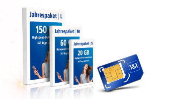 1&1 Prepaid Jahrespaket M mit 60 GB Highspeed-Volumen/Jahr (bis zu 300 MBit/s im Download/bis zu 50 MBit/s im Upload, nach Verbrauch je max. 64 kBit/s) für 69,99 € einmalig, zahlbar im Voraus. Gratis Telefonieren und Surfen gilt nicht für Sonder- und Premiumdienste, Verbindungen aus Deutschland ins Ausland sowie Roaming außerhalb EU gemäß Preisliste. Telefonate in dt. Fest- und Handynetze inklusive sowie Verbindungen innerhalb des EU-Auslands und aus EU nach Deutschland plus Island, Liechtenstein und Norwegen. Ggfs. entstandene verbrauchsabhängige Kosten werden monatlich abgerechnet. Bereitstellungspreis 0,– € . 12 Monate Mindestvertragslaufzeit. Der Vertrag endet automatisch nach Ablauf der Mindestvertragslaufzeit, ohne dass es einer Kündigung bedarf. Die Aktivierung setzt eine Identitätsprüfung durch Vorlage eines Ausweises voraus.