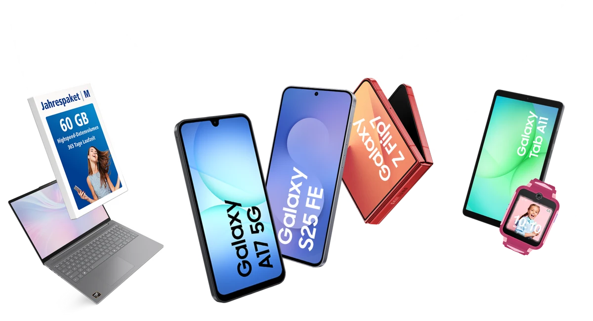 Das Samsung Galaxy A17 5G, das Samsung Galaxy S25 FE oder das Samsung Galaxy Z Flip7, z.B. in Verbindung mit der 1&1 All-Net-Flat XS mit Multicard und 10 GB Highspeed-Volumen/Mon. (bis zu 300 MBit/s Download/bis zu 50 MBit/s Upload, danach je max. 64 kBit/s) für dauerhaft 9,99 €/Mon. (A17), 19,99 €/Mon. (S25 FE) bzw. 29,99 €/Mon. (Z Flip7). Mindestvertragslaufzeit je 24 Monate, danach jederzeit kündbar mit 30,– € (A17), 150,– € (S25 FE) bzw. 270,– € (Z Flip7) Einmalzahlung, zahlbar bei Vertragsende, spätestens nach 36 Vertragsmonaten. Oder ohne Einmalzahlung bei Auswahl eines neuen Geräts bei 1&1 und Rücksendung des Altgerätes in gebrauchsfähigem Zustand. Alternativ wird treuen Kunden, sofern der Vertrag nach 36 Monaten noch besteht, die Einmalzahlung im 36. Monat automatisch gutgeschrieben, sodass sie sich auf 0,– € reduziert (Geräterückgabe hierfür nicht erforderlich). Gratis Telefonieren gilt nicht für Sonder- und Premiumdienste, Verbindungen aus Deutschland ins Ausland sowie Roaming außerhalb der EU gemäß Preisliste. Inklusive Telefonate in dt. Fest- und Handynetze sowie Verbindungen innerhalb des EU-Auslands und aus der EU nach Deutschland. Energieeffizienz: S25 FE: B, A17 5G: B, Z Flip7: B. Bereitstellungspreis je 39,90 €. Das Lenovo IdeaPad Slim 5 oder das Samsung Galaxy Tab A11, z.B. in Verbindung mit der 1&1 Daten-Flat S mit 10 GB Highspeed-Volumen/Mon. (bis zu 300 MBit/s Download/bis zu 50 MBit/s Upload, danach je max. 64 kBit/s), für 29,99 €/Mon. (IdeaPad Slim 5) bzw. 14,99 €/Mon. (Tab A11). Mindestvertragslaufzeit je 24 Monate, danach jederzeit kündbar mit 260,– € (IdeaPad Slim 5) bzw. 80,– € (Tab A11) zahlbar bei Vertragsende, spätestens nach 36 Vertragsmonaten. Oder ohne Einmalzahlung bei Auswahl eines neuen Geräts bei 1&1 und Rücksendung des Altgerätes in gebrauchsfähigem Zustand. Alternativ wird treuen Kunden, sofern der Vertrag nach 36 Monaten noch besteht, die Einmalzahlung im 36. Monat automatisch gutgeschrieben, sodass sie sich auf 0,– € reduziert (Geräterückgabe hierfür nicht erforderlich). Gratis Surfen gilt nicht für Sonder- und Premiumdienste. Eine Nutzung der Datenflatrate für Voice over IP ist nicht gestattet. Energieeffizienz Tab A11: D. Bereitstellungspreis je 39,90 €. Die TCL Kids Watch, z.B. in Verbindung mit 1&1 Kids 1GB mit 1 GB Highspeed-Volumen/Mon. (bis zu 50 MBit/s Download/bis zu 25 MBit/s Upload, danach je max. 64 kBit/s) für 7,99 €/Mon. Telefonie/SMS: 100 Freieinheiten für Telefon-Minuten und/oder SMS pro Monat in alle Fest- und Mobilfunknetze innerhalb Deutschlands, des EU-Auslands und aus EU nach Deutschland plus Island, Liechtenstein und Norwegen. Kostenkontrolle durch voreingestellt gesperrte kostenpflichtige Sonder- und Servicerufnummern der Rufnummerngassen 0900, 0180, 118 und 0137 bei Inlandsnutzung, Premium-Voice/SMS, internationale Verbindungen aus Deutschland ins Ausland sowie Roaming-Verbindungen; Internationale Verbindungen aus Deutschland ins Ausland sowie Roaming-Verbindungen auf Kundenwunsch wieder aktivierbar; Preise gemäß Preisliste. Auf Wunsch inklusive Einrichtungshilfe für Kinderschutz-Apps Google Family Link oder Apple iOS Kinderschutz. Bereitstellungspreis 19,90 €. 24 Monate Mindestlaufzeit. 1&1 Prepaid Jahrespakete z.B. das Jahrespaket S mit 20 GB Highspeed-Volumen/Jahr (bis zu 300 MBit/s im Download/bis zu 50 MBit/s im Upload, nach Verbrauch je max. 64 kBit/s) für 49,99 € einmalig, zahlbar im Voraus. Einmalige SIM-Kartengebühr 29,90 €, inklusive 30 € Startguthaben nach Aktivierung. 12 Monate Mindestvertragslaufzeit. Der Vertrag endet automatisch ohne, dass es einer Kündigung bedarf. Für alle Angebote gilt: Änderungen und Irrtümer vorbehalten. Preise inkl. MwSt. 1&1 Telecom GmbH, Elgendorfer Straße 57, 56410 Montabaur.
