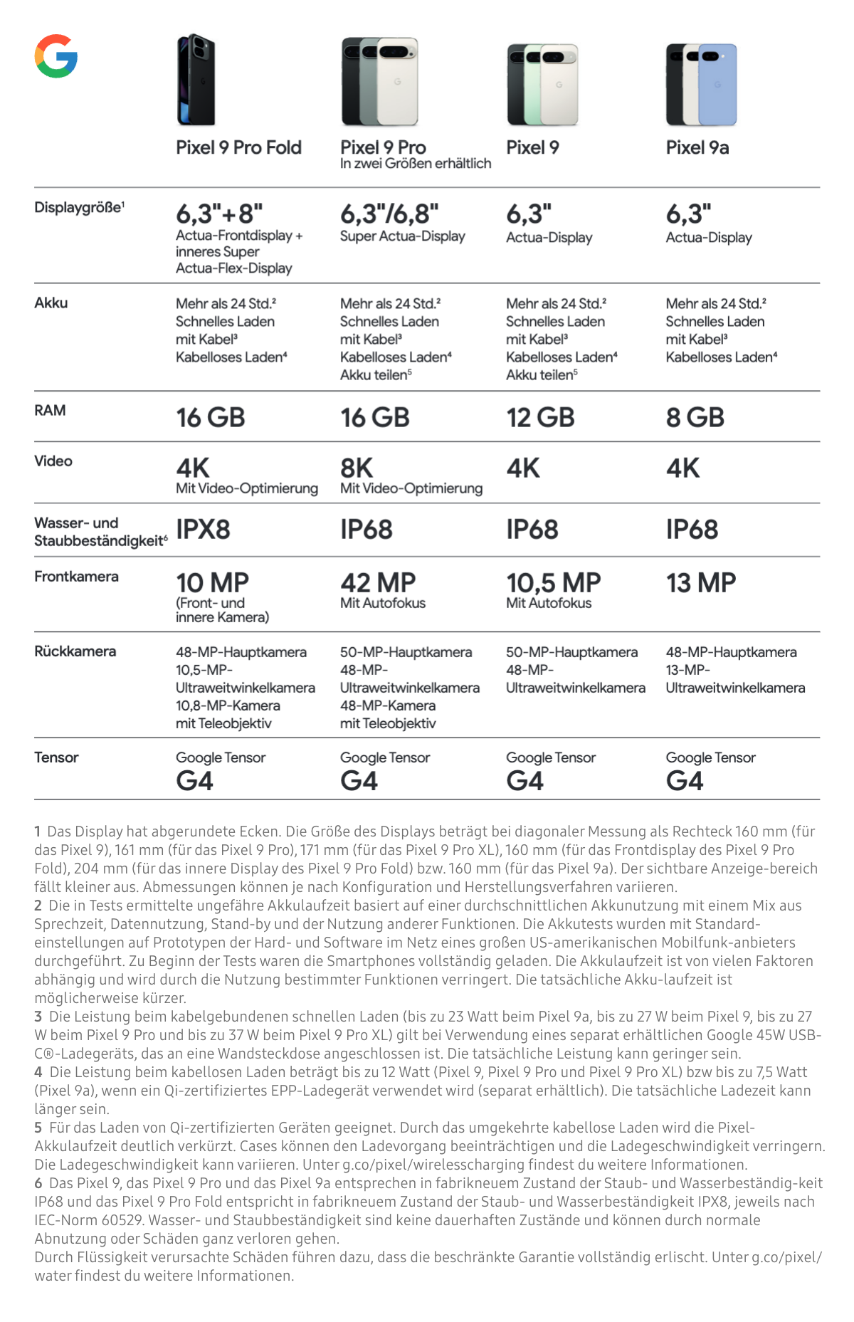 Google Smartphones, z.B. das Google Pixel 10, Pixel 10 Pro oder Pixel 10 Pro XL, z.B. in Verbindung mit der 1&1 All-Net Flat S mit Multicard und 30 GB Highspeed-Volumen/Mon. (bis zu 300 MBit/s Download/bis zu 50 MBit/s Upload, danach je max. 64 kBit/s) für 37,99 €/Mon. (Pixel 10), 44,99 €/Mon. (Pixel 10 Pro) oder 49,99 €/Mon. (Pixel 10 Pro XL). Mindestvertragslaufzeit je 24 Monate, danach jederzeit kündbar mit 280,– € (Pixel 10), 360,– € (Pixel 10 Pro) oder 420,– € Pixel 10 Pro XL) Einmalzahlung – zahlbar bei Vertragsende, spätestens nach 36 Vertragsmonaten. Oder ohne Einmalzahlung bei Auswahl eines neuen Geräts bei 1&1 und Rücksendung des Altgerätes in gebrauchsfähigem Zustand. Alternativ wird treuen Kunden, sofern der Vertrag nach 36 Monaten noch besteht, die Einmalzahlung im 36. Monat automatisch gutgeschrieben, sodass sie sich auf 0,– € reduziert (Geräterückgabe hierfür nicht erforderlich). Inklusive Telefonate in dt. Fest- und Handynetze sowie Verbindungen innerhalb des EU-Auslands und aus der EU nach Deutschland. Gratis Telefonieren und Surfen gilt nicht für Sonder- und Premiumdienste, Verbindungen aus Deutschland ins Ausland sowie Roaming außerhalb EU gemäß Preisliste. Bereitstellungspreis je 39,90 €.