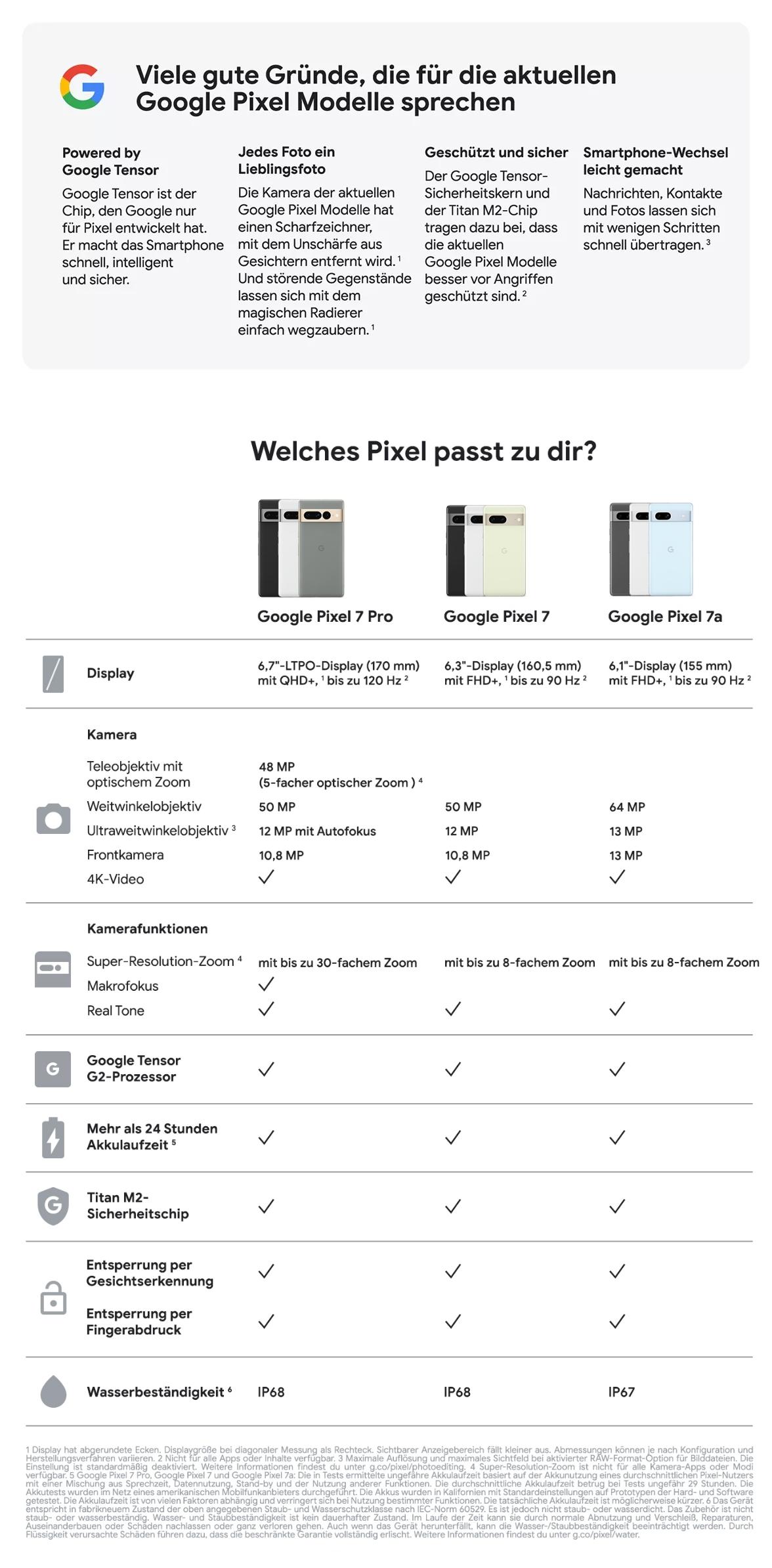 Die Google Pixel Smartphones überzeugen neben einer erstklassigen Hardware mit einer starken Software und einer ausgezeichneten Kameratechnik. Mit dem Einsatz künstlicher Intelligenz entstehen mit Google Handys selbst bei schlechten Lichtverhältnissen eindrucksvolle Aufnahmen. Nehmen Sie Weitwinkelbilder in höchster Qualität auf, während Sie mit dem Teleobjektiv detailreiche Fotos auch auf Entfernung schießen. Bei einem Google Pixel Handy profitieren Sie zudem von einer hohen Bildschirmauflösung, moderner Display Technik wie Super Actua und einer umfassenden Software mit zahlreichen Features. Auch die verbaute Prozessortechnologie, der interne Speicher und das kabellose Laden machen das Google Pixel mit Vertrag zu einem ernsthaften Konkurrenten zu Samsung, Apple oder Xiaomi